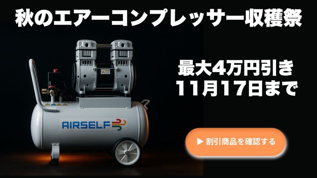 秋のエアーコンプレッサー収穫祭開催中。大人気50 Lモデルから業務用80Lモデルまで、11月17日まで最大4万円の特別価格で販売中。