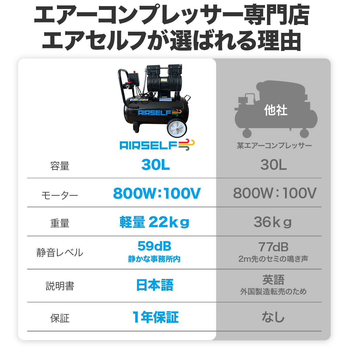 ・日本製の同スペックの静音エアーコンプレッサーと比較して3割前後もお求めやすい価格です。