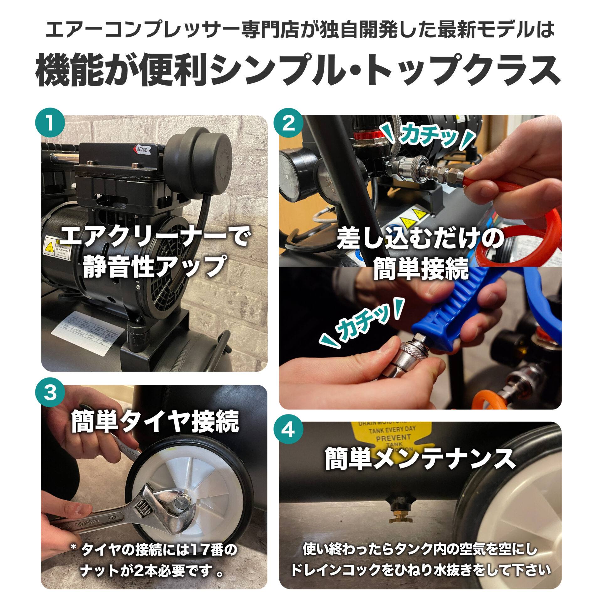 ・人気のオイルレス型エアーコンプレッサーのためメンテナンスは簡単で何年にも渡り長く愛用いただけます。