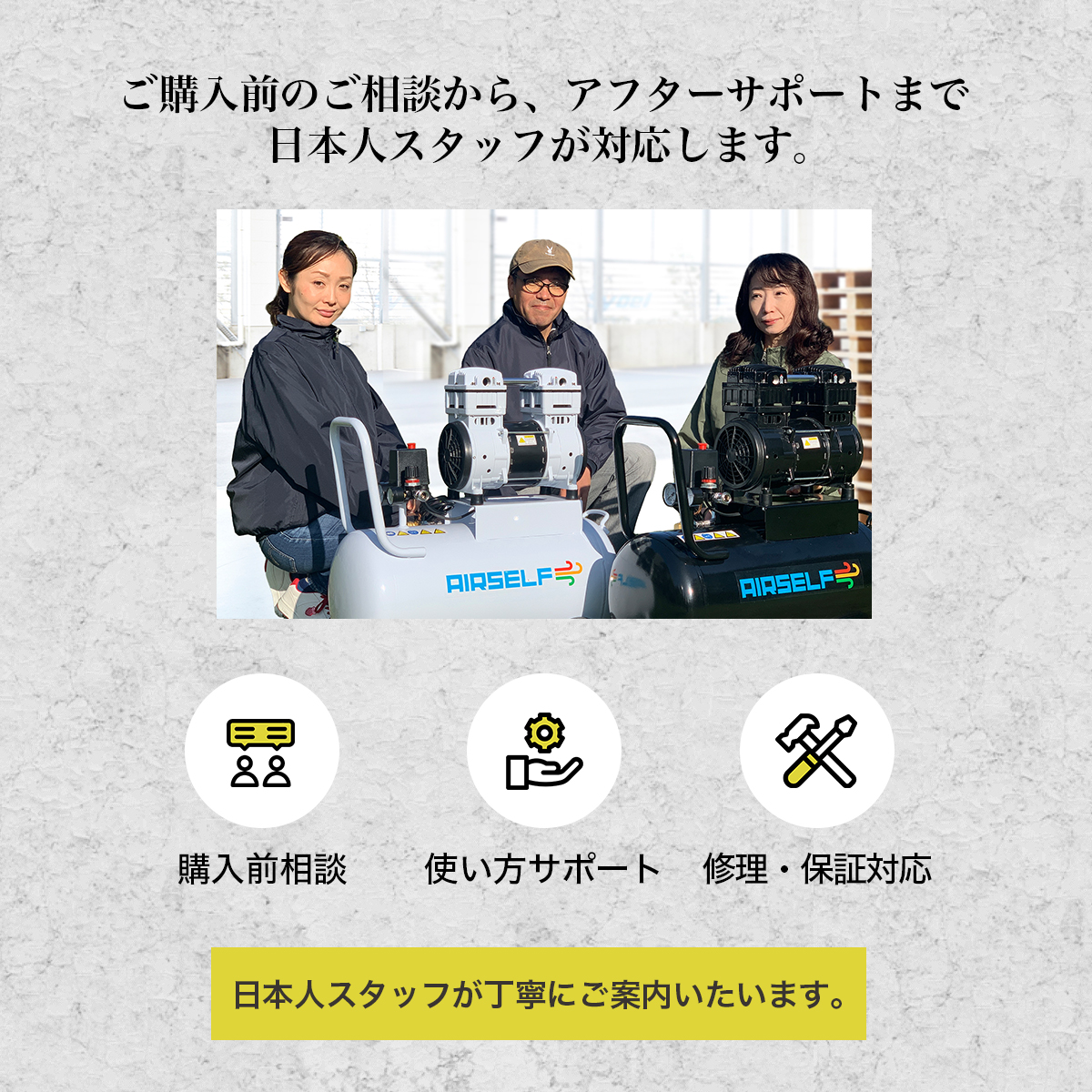 電動ネイラーは便利ですが、重量や反動、連続使用での疲労が作業テンポを乱すことがあります。エアネイラーは軽く、引き金操作もシンプルだからこそエアセルフは、その特長を最大限に活かせるよう、連続使用でも圧が落ちにくい安定したエア供給を重視しています。だから、打つ→合わせる→打つ、という流れが止まらず、リズムよく、効率よく進めたい現場からの声が届いております。